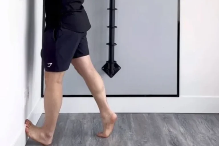 Apoya las manos en la pared y estira una pierna hacia atrás. Ayuda a relajar los gemelos y evitar sobrecargas.