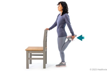 De pie, lleva el pie hacia el glúteo. Ideal para relajar la parte frontal del muslo.